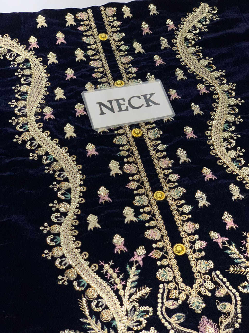 Complemented by a net embroidered dupatta with 4-side cutwork appliqué and a soft silk/satin trouser, this Velvet Embroidered Suit is a ready-to-wear luxury dress that blends tradition with modern style.